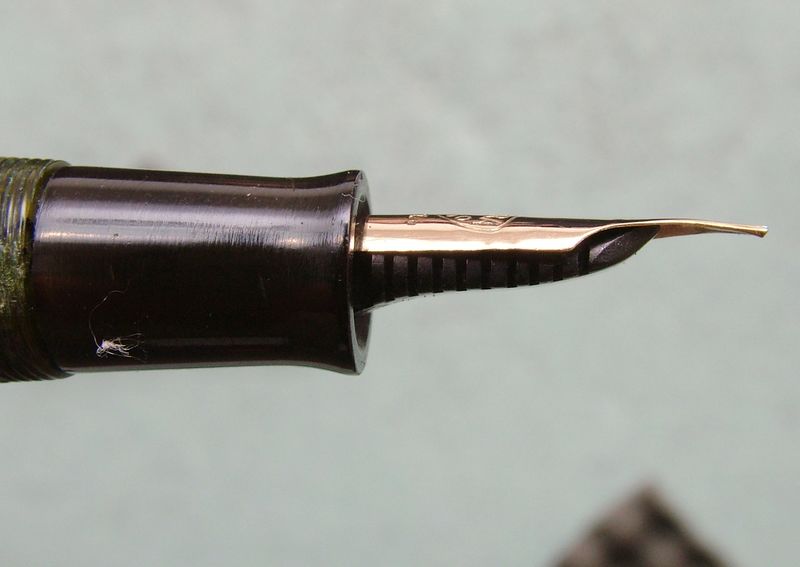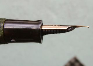 Photo of a pen produced by Aurora. Model: Novum. Filling system: back lever. In green marbled celluloid. Big size, second version, faceted.