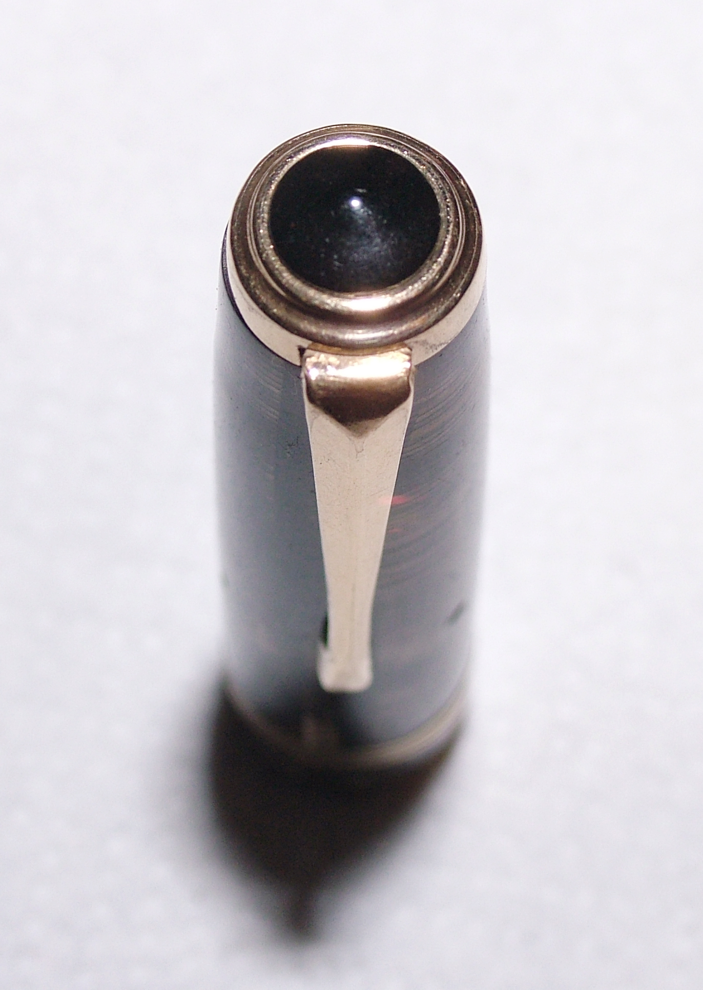 Photo of a pen produced by Aurora. Model: Novum. Filling system: back lever. In snake skin brown celluloid. Detail of cap head. Medium size, third version, round.
