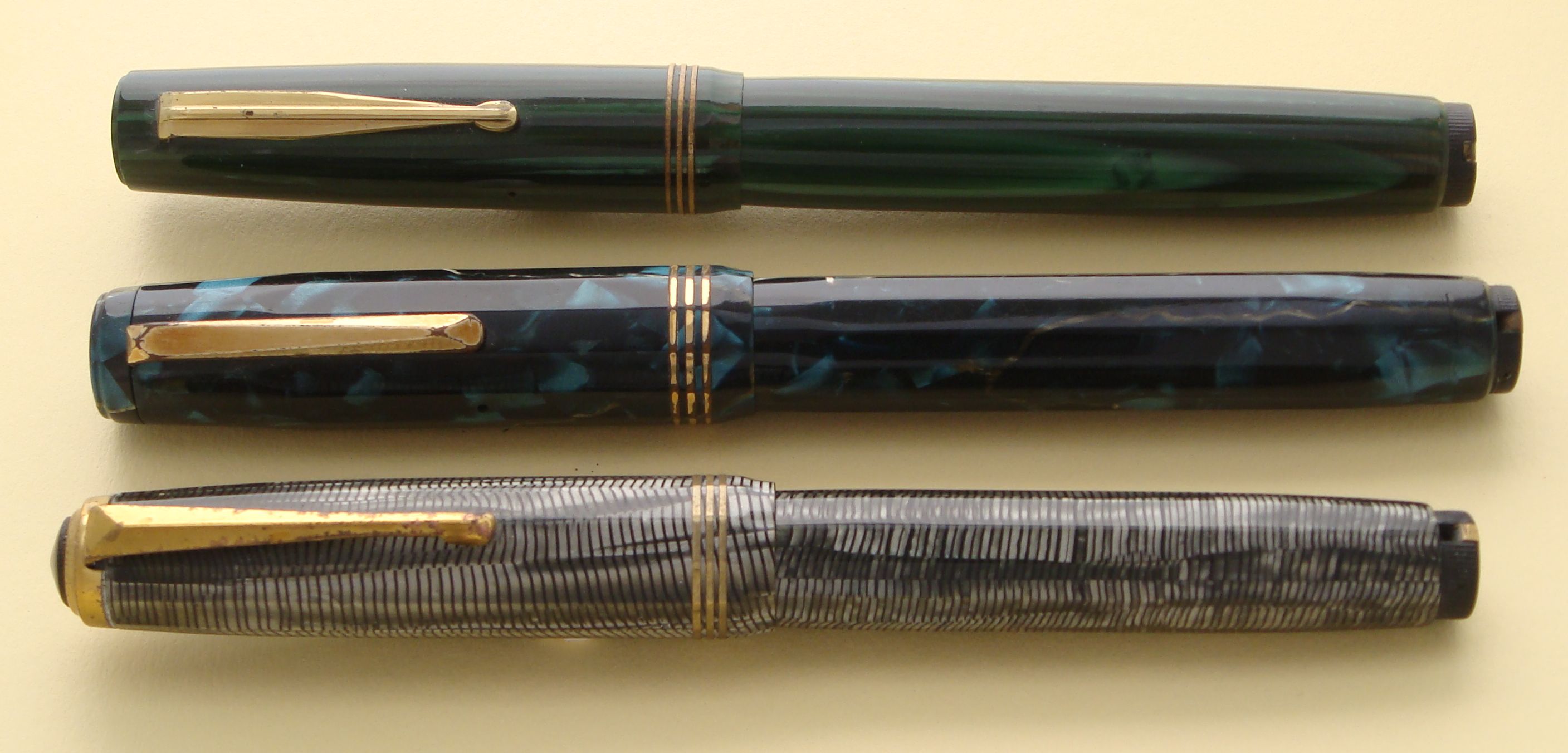 Foto di una penna Aurora. Modello: Novum. Caricamento a levetta di fondo. Realizzazione in celluloide. Le tre diverse versioni in cui venne realizzata la Novum. Contributo di Roberto Vetrugno (utente forum.fountainpen.it roberto v).