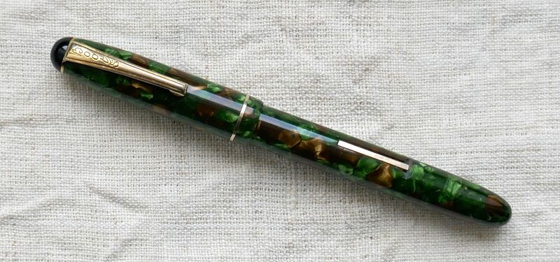 Photo of a pen produced by Boots. Model: Chatsworth. Filling system: lever filler. In gray and brown marbled celluloid.