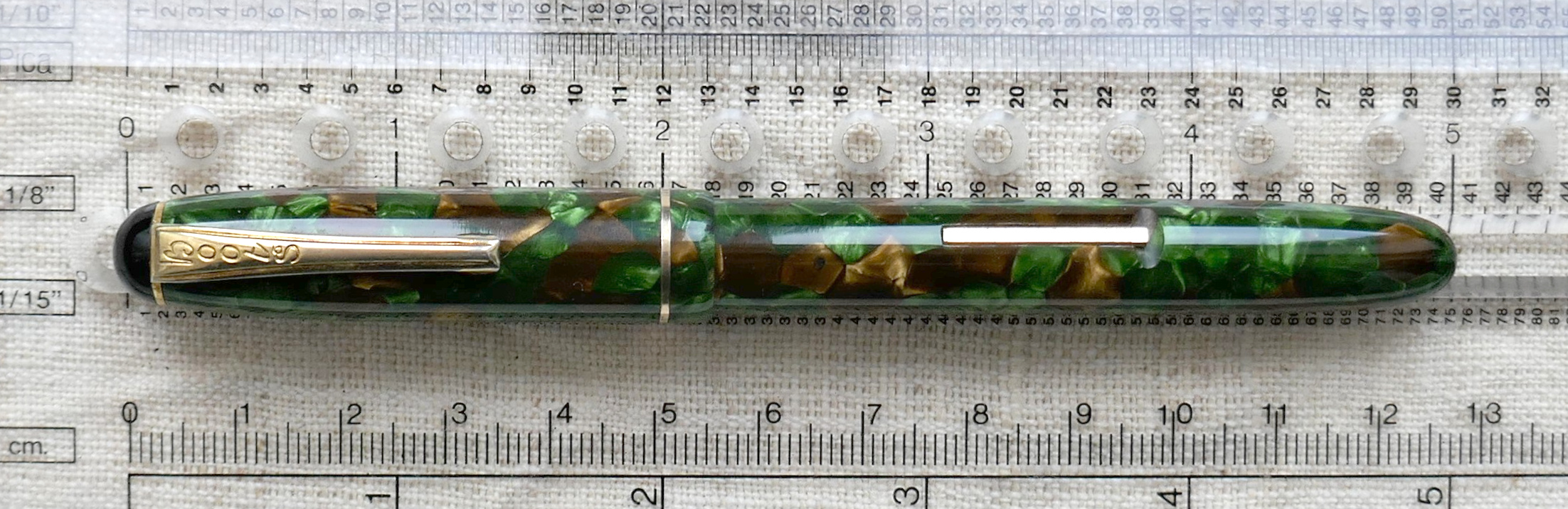 Photo of a pen produced by Boots. Model: Chatsworth. Filling system: lever filler. In gray and brown marbled celluloid.