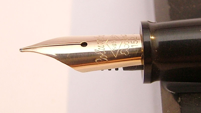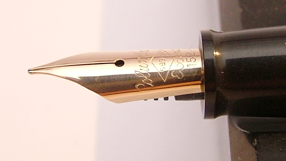 Photo of a desk pen produced by Columbus. Model: Columbus Extra 14. Filling system: lever filler. In striped brown celluloid. Detail of nib.