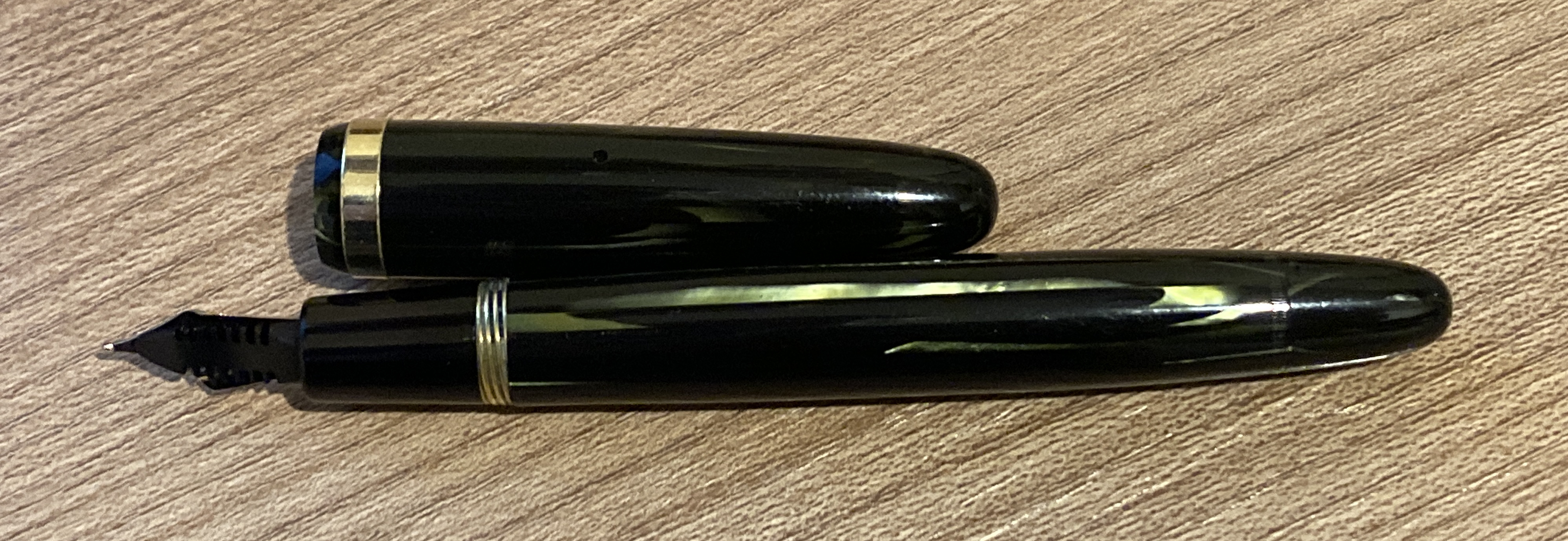 Photo of a pen produced by Columbus. Model: Columbus Extra 38. Filling system: piston filler. In green arco celluloid. Second version, ogival shape.