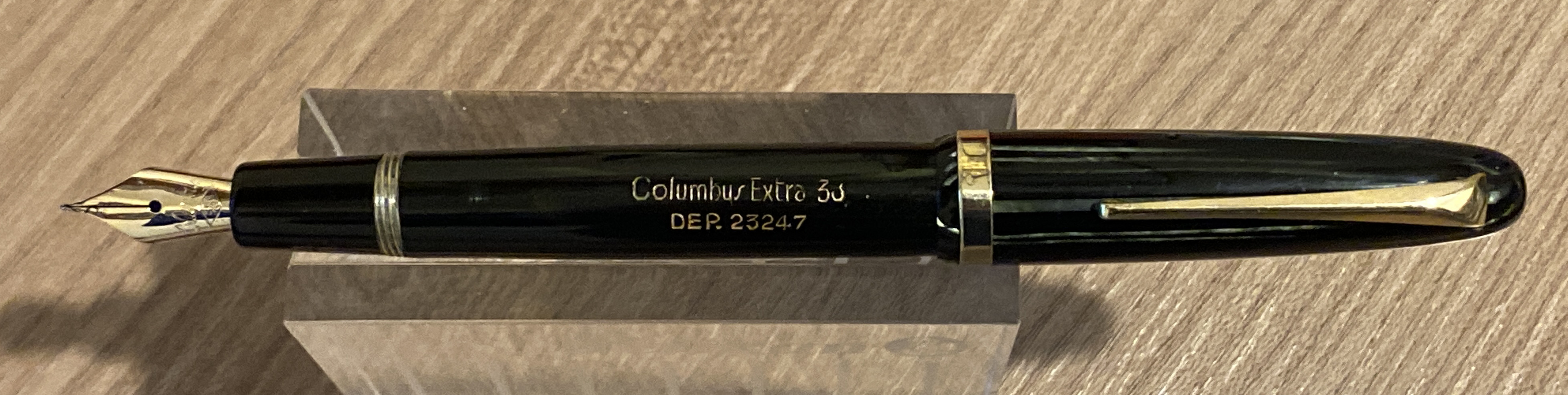 Photo of a pen produced by Columbus. Model: Columbus Extra 38. Filling system: piston filler. In green arco celluloid. Second version, ogival shape.