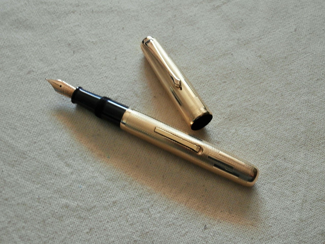 Photo of a pen produced by Columbus. Filling system: lever filler. With geometric pattern gold rolled overlay. Medium size.