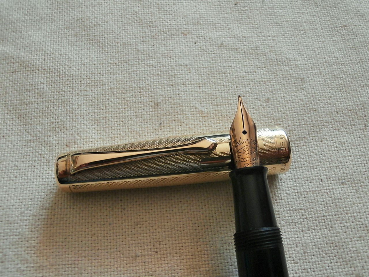 Photo of a pen produced by Columbus. Filling system: lever filler. With geometric pattern gold rolled overlay. Medium size.