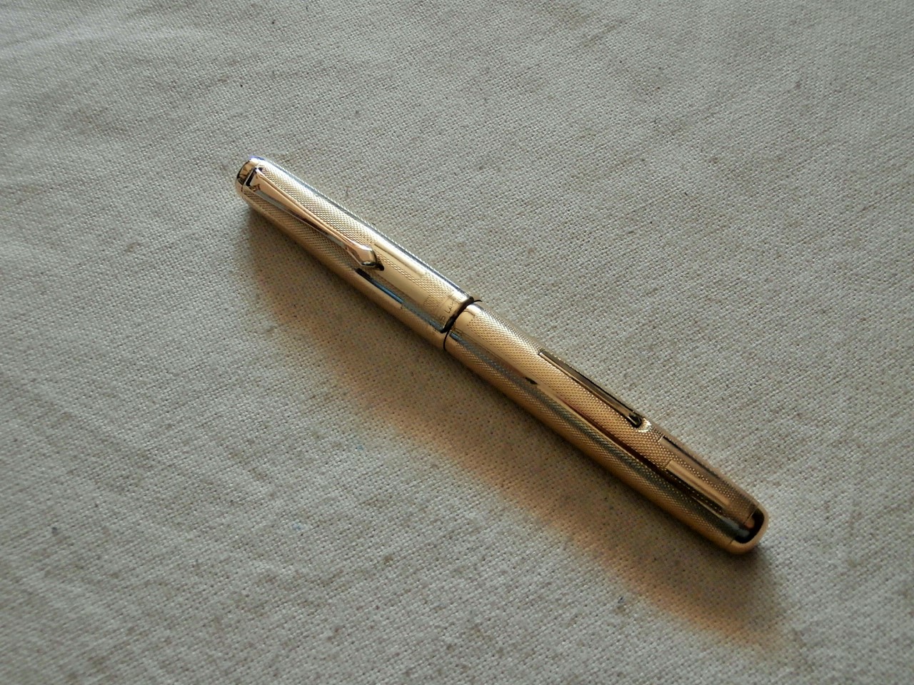 Photo of a pen produced by Columbus. Filling system: lever filler. With geometric pattern gold rolled overlay. Medium size.