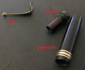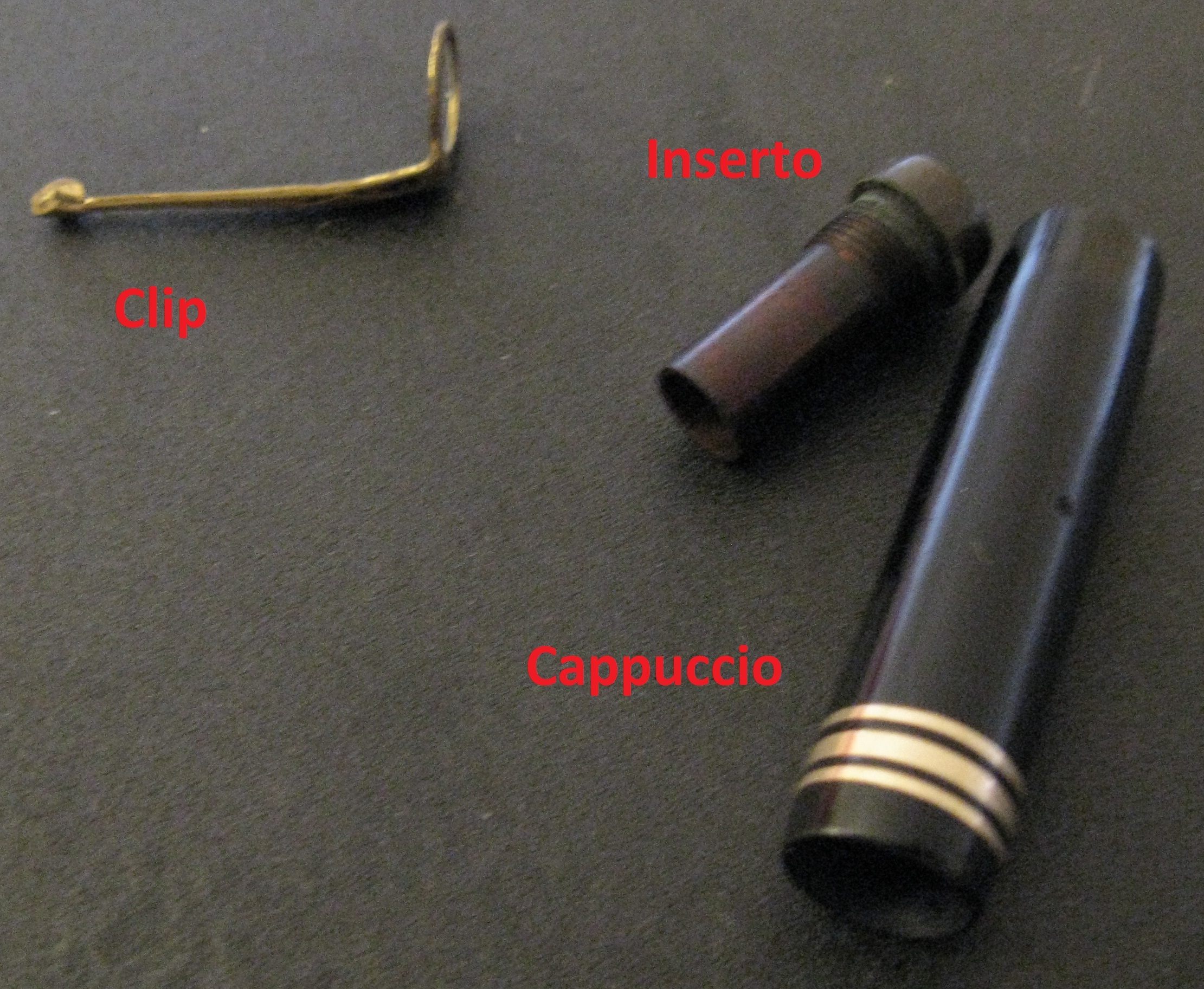 Cappuccio di una Conway Stewart 388 nelle sue tre parti, il cappuccio in celluloide, l'inserto in ebanite e la clip placcata oro.