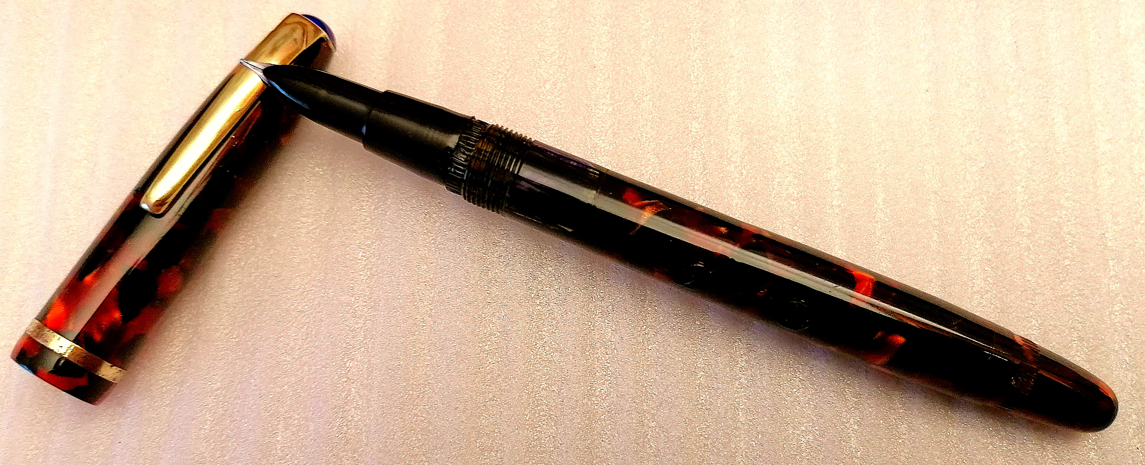 Foto di una penna Dacis. Caricamento a stantuffo. Realizzazione in celluloide marmorizzata rossa. Modello ignoto marcato AVR (Anna Vitiello - Roma). Contributo di Lucio, (utente forum Lucio54).