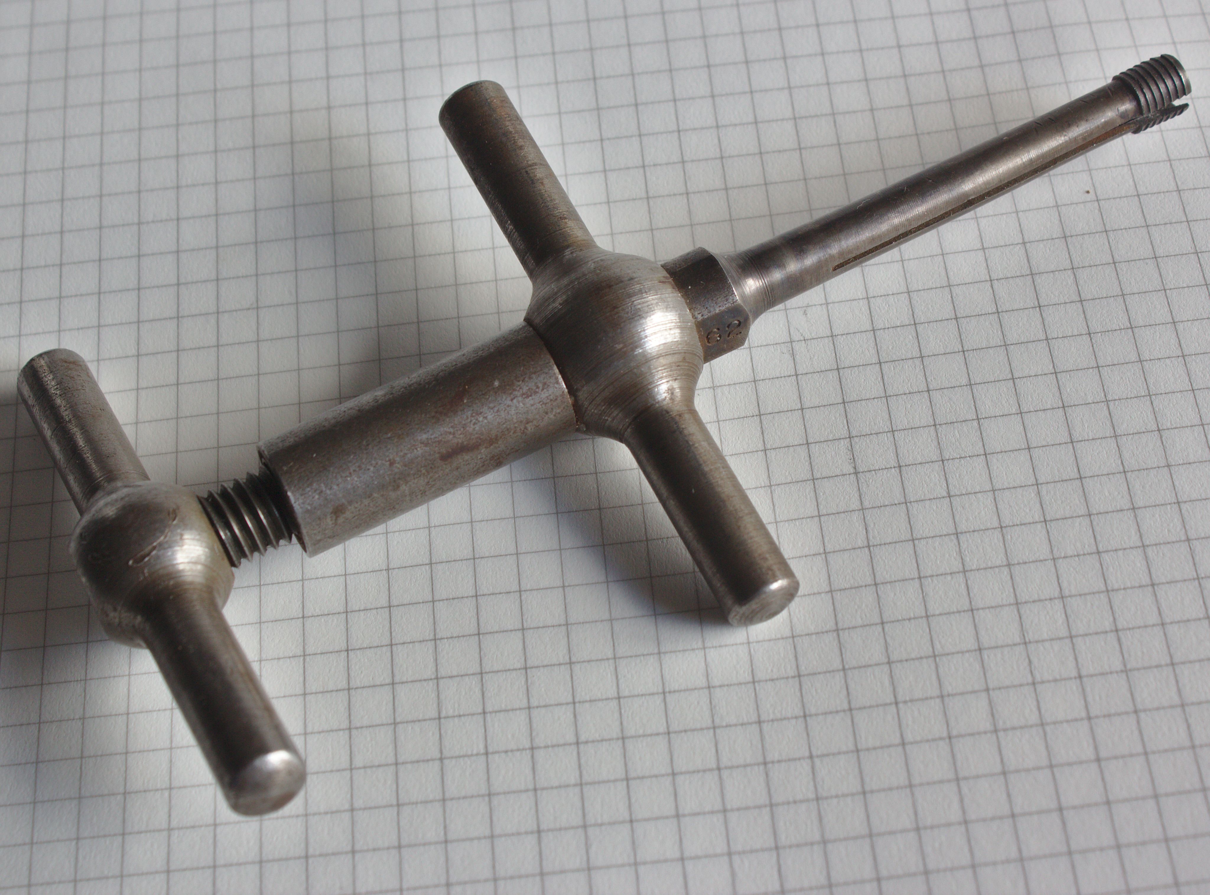 Un estrattore per controcappucci aperto, nella posizione in cui si deve trovare per far presa sull'interno del controcappuccio.