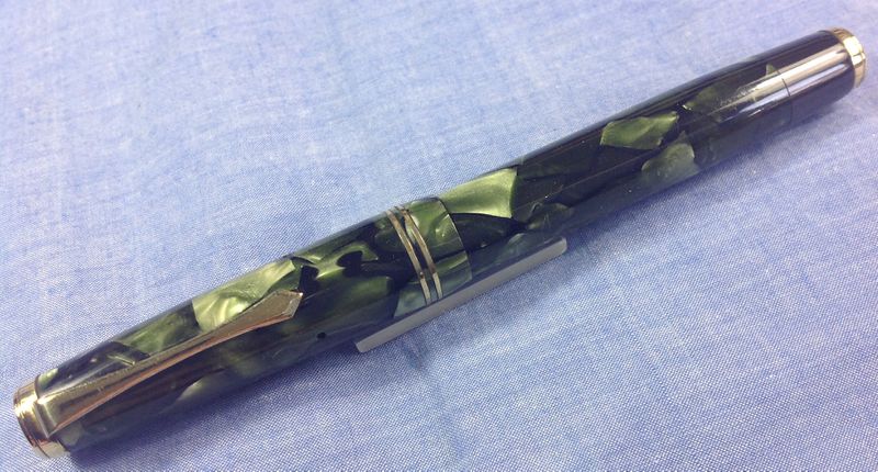 Photo of a pen produced by Aurora. Model: Aurora Iridia. Filling system: button filler. In green marbled celluloid. Big size, #2½ nib, imprinted with 69.