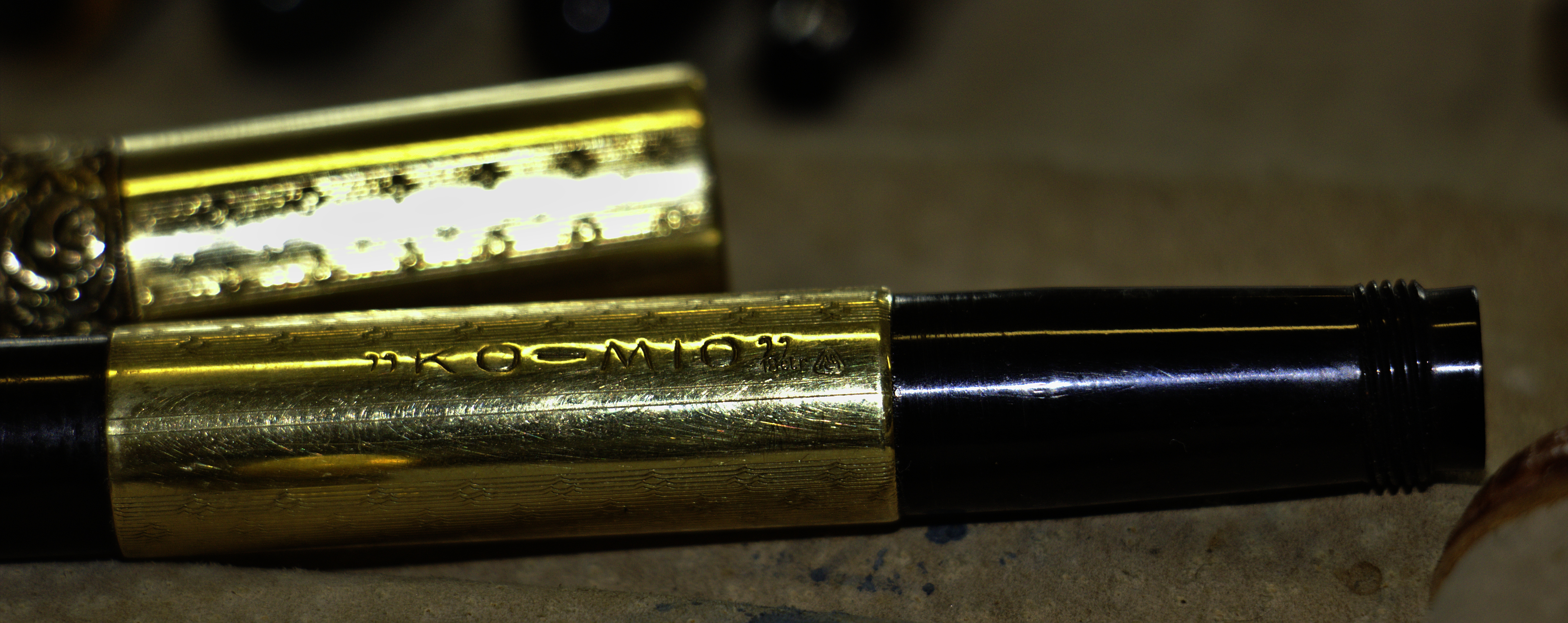 Photo of a pen produced by KO-MIO. Filling system: safety. With engraved head and geometrical pattern gold rolled overlay. A pen with a Kaweco sub-brand name, but with a Montegrappa punch on the overlay. Photographed at 2017 Torino Pen Show.