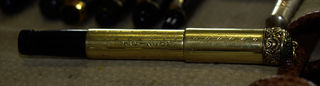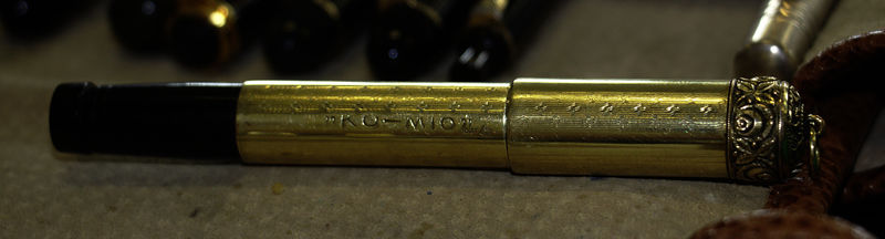 Photo of a pen produced by KO-MIO. Filling system: safety. With engraved head and geometrical pattern gold rolled overlay. A pen with a Kaweco sub-brand name, but with a Montegrappa punch on the overlay. Photographed at 2017 Torino Pen Show.