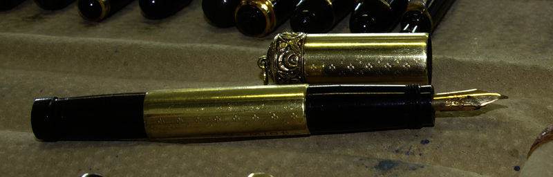 Photo of a pen produced by KO-MIO. Filling system: safety. With engraved head and geometrical pattern gold rolled overlay. A pen with a Kaweco sub-brand name, but with a Montegrappa punch on the overlay. Photographed at 2017 Torino Pen Show.