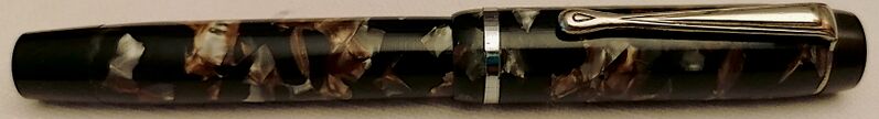 Photo of a pen produced by Littoria. Model: Littoria 38. Filling system: button filler. In marbled gray celluloid. Interesting model with transparent window.