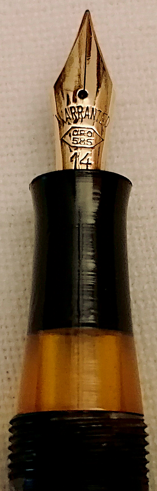 Photo of a pen produced by Littoria. Model: Littoria 38. Filling system: button filler. In marbled gray celluloid. Detail of nib. Interesting model with transparent window.