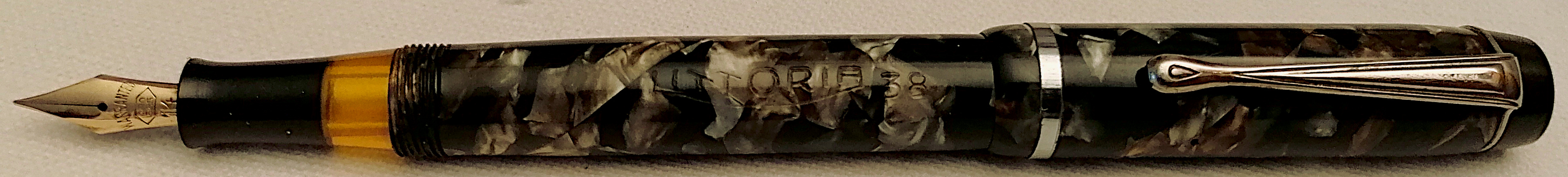 Photo of a pen produced by Littoria. Model: Littoria 38. Filling system: button filler. In marbled gray celluloid. Interesting model with transparent window.