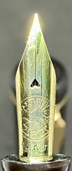 Photo of the logo imprinted on Greif nibs, depicting a griffon in a circle, the same one used generically by the company. Excerpt of this image.
