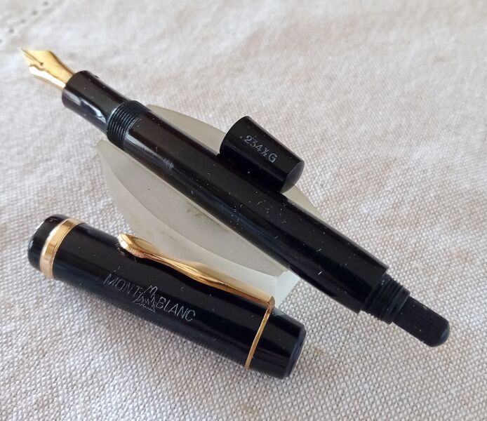 Foto di una penna Montblanc. Modello: Montblanc 234½. Caricamento a stantuffo. Realizzazione in celluloide nera. Versione di lusso con fermaglio e veretta identiche a quelle della serie 13x. Contributo di Fabrizio Falchi, (utente forum fountainpen.it fab66).