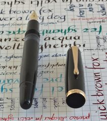 Foto di una penna Montblanc. Modello: Montblanc 342. Caricamento a stantuffo. Realizzazione in resina plastica nera. Sesta variante del modello, (una di quelle classificate anche come MkII), con finestra blu, banda stampigliata, sezione dritta e fondello lungo.