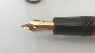 Photo of a pen produced by Montblanc. Model: Montblanc 46. Filling system: piston filler. In black celluloid. Detail of nib. Spain produced model. Show the imprint "Fabricado en Espana por F. Wiesl".