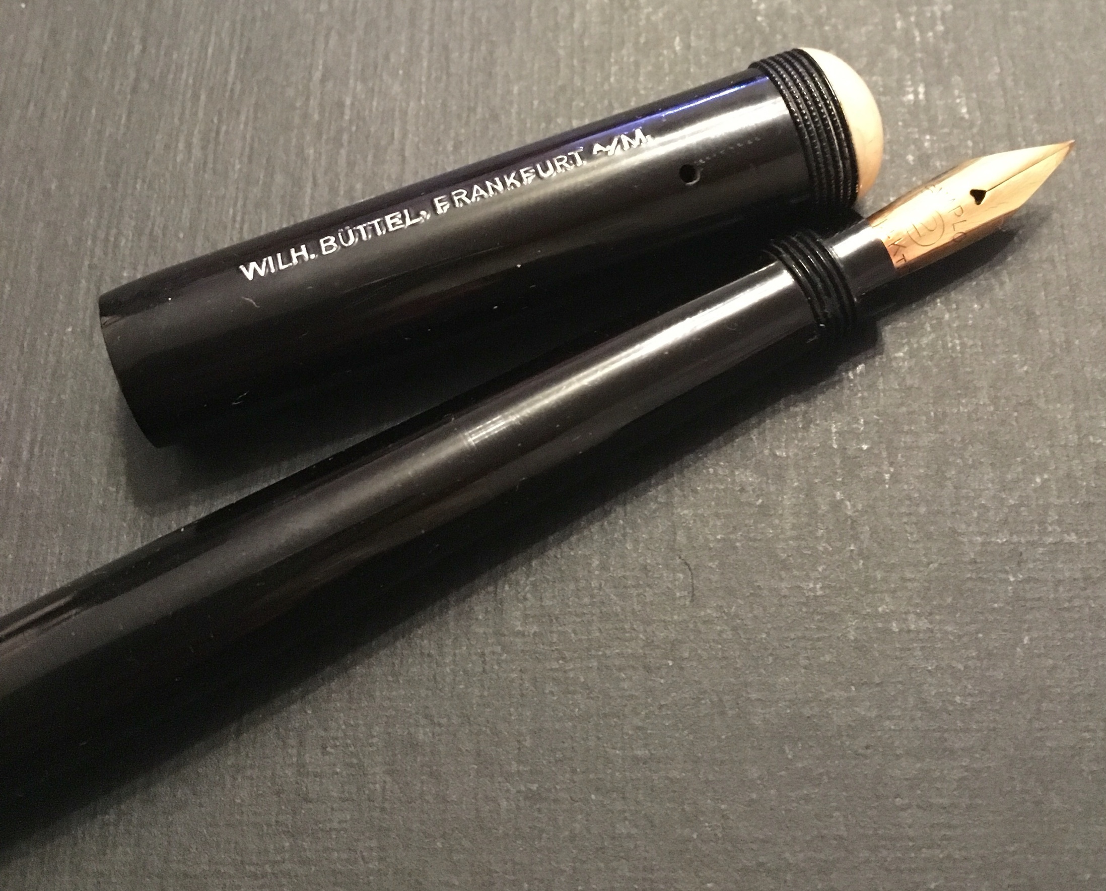 Foto di una penna Montblanc. Caricamento rientrante. Realizzazione in ebanite nera. Modello antico, con testina del cappuccio completamente bianca, normalmente numerato secondo il prezzo (12 marchi), ma con numerazione anomala 122, e pennino #2 "St" (da "starr", rigido). Contributo di Sumit (utente forum Sumit).