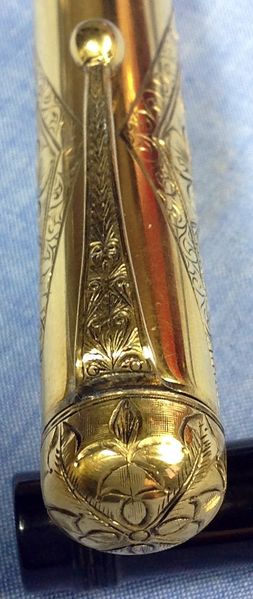 Photo of a pen produced by Montblanc. Filling system: safety. With burin engraved gold rolled overlay. Detail of cap. Oldest version (transitional?) with threaded knob, #4 nib marked "SIMPLO" with the number in a circle (1912-1918 production).