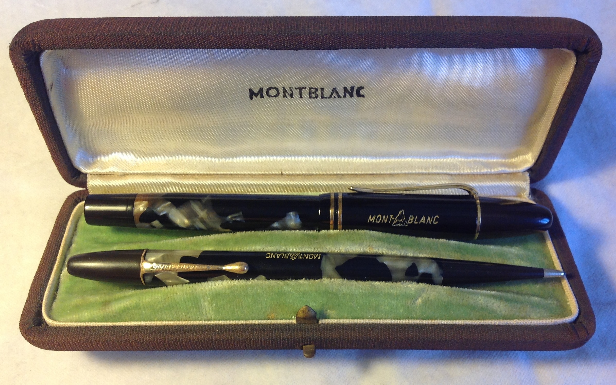 Photo of a pen/pencil set produced by Montblanc. Model: Montblanc L30. Filling system: button filler. In pearl and black celluloid. With black cap.