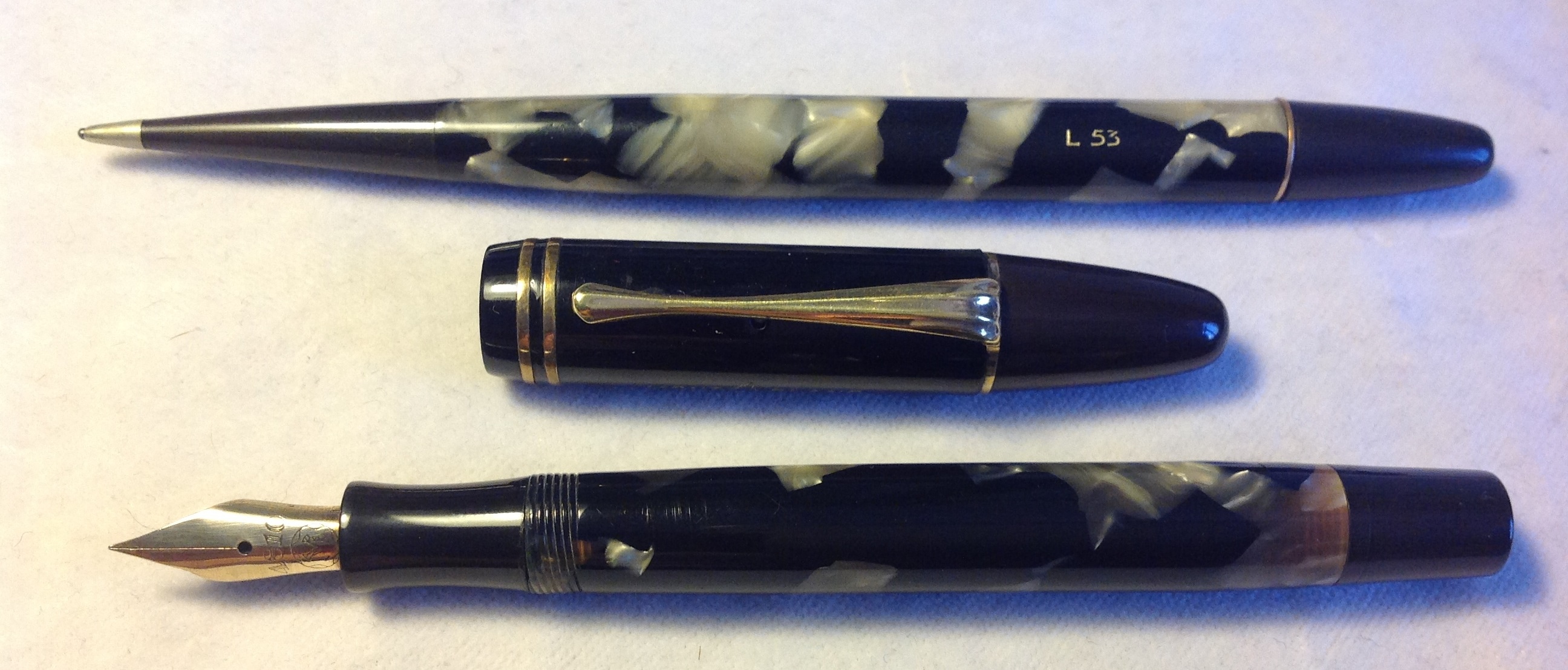 Photo of a pen/pencil set produced by Montblanc. Model: Montblanc L30. Filling system: button filler. In pearl and black celluloid. With black cap.