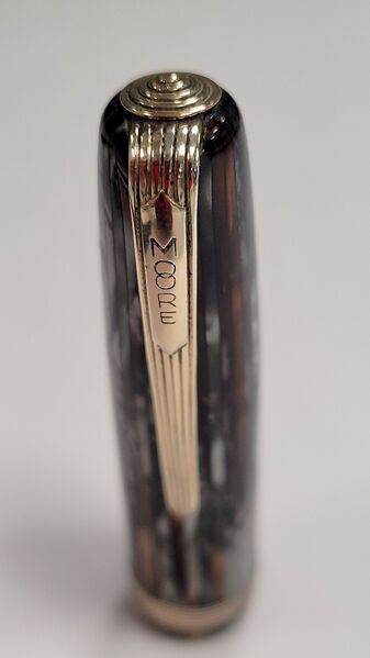 Foto di una penna Moore. Modello: Moore 92A. Caricamento a levetta. Realizzazione in celluloide a strisce grigio perla e bronzo. Dettaglio del fermaglio. Con veretta a cinque righe sul cappuccio e jewel metallico scalettato. Contributo di Walter (utente forum Wall).