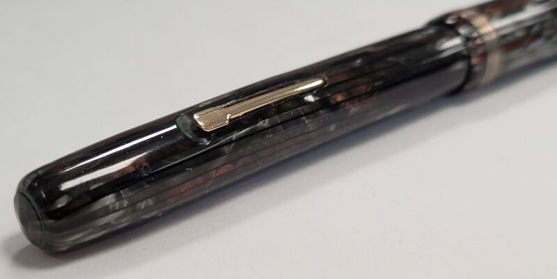 Photo of a pen produced by Moore. Model: Moore 92A. Filling system: lever filler. In gray pearl and bronze striped celluloid. With five lined cap ring ad stepped metal jewel.