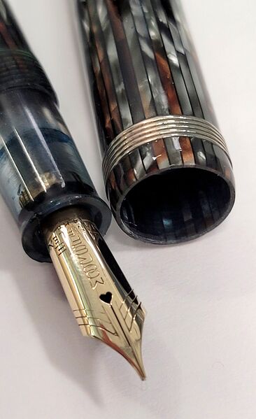 Photo of a pen produced by Moore. Model: Moore 92A. Filling system: lever filler. In gray pearl and bronze striped celluloid. With five lined cap ring ad stepped metal jewel.