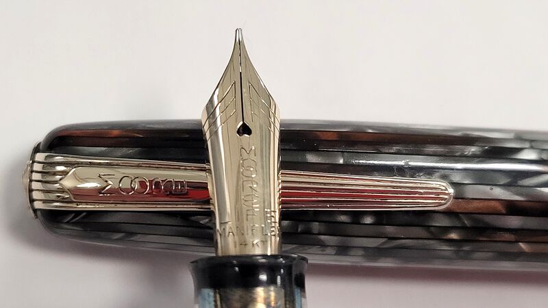 Photo of a pen produced by Moore. Model: Moore 92A. Filling system: lever filler. In gray pearl and bronze striped celluloid. Detail of nib. With five lined cap ring ad stepped metal jewel.