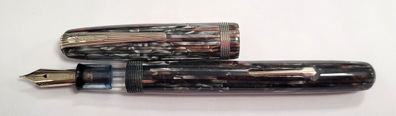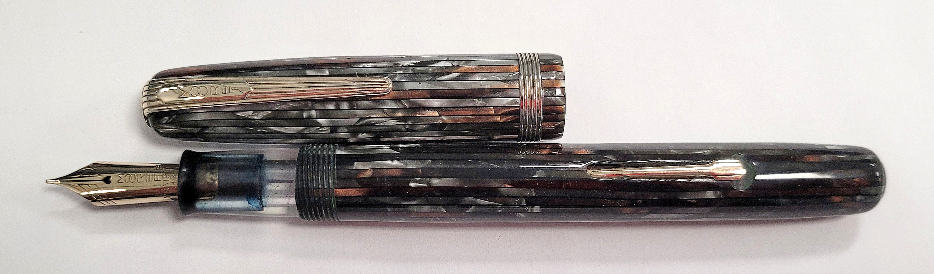 Photo of a pen produced by Moore. Model: Moore 92A. Filling system: lever filler. In gray pearl and bronze striped celluloid. With five lined cap ring ad stepped metal jewel.