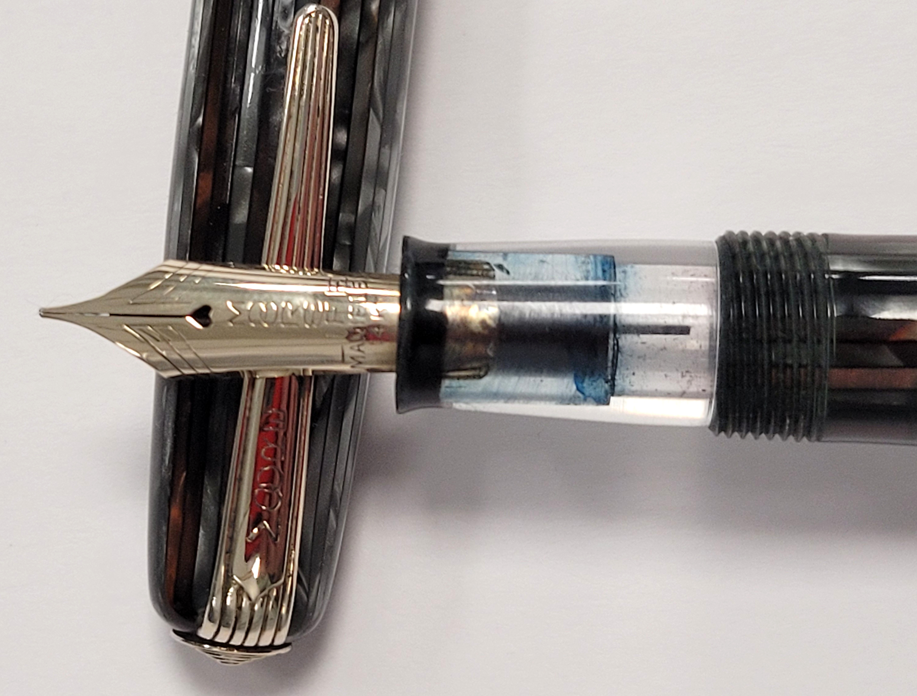 Photo of a pen produced by Moore. Model: Moore 92A. Filling system: lever filler. In gray pearl and bronze striped celluloid. Detail of nib. With five lined cap ring ad stepped metal jewel.
