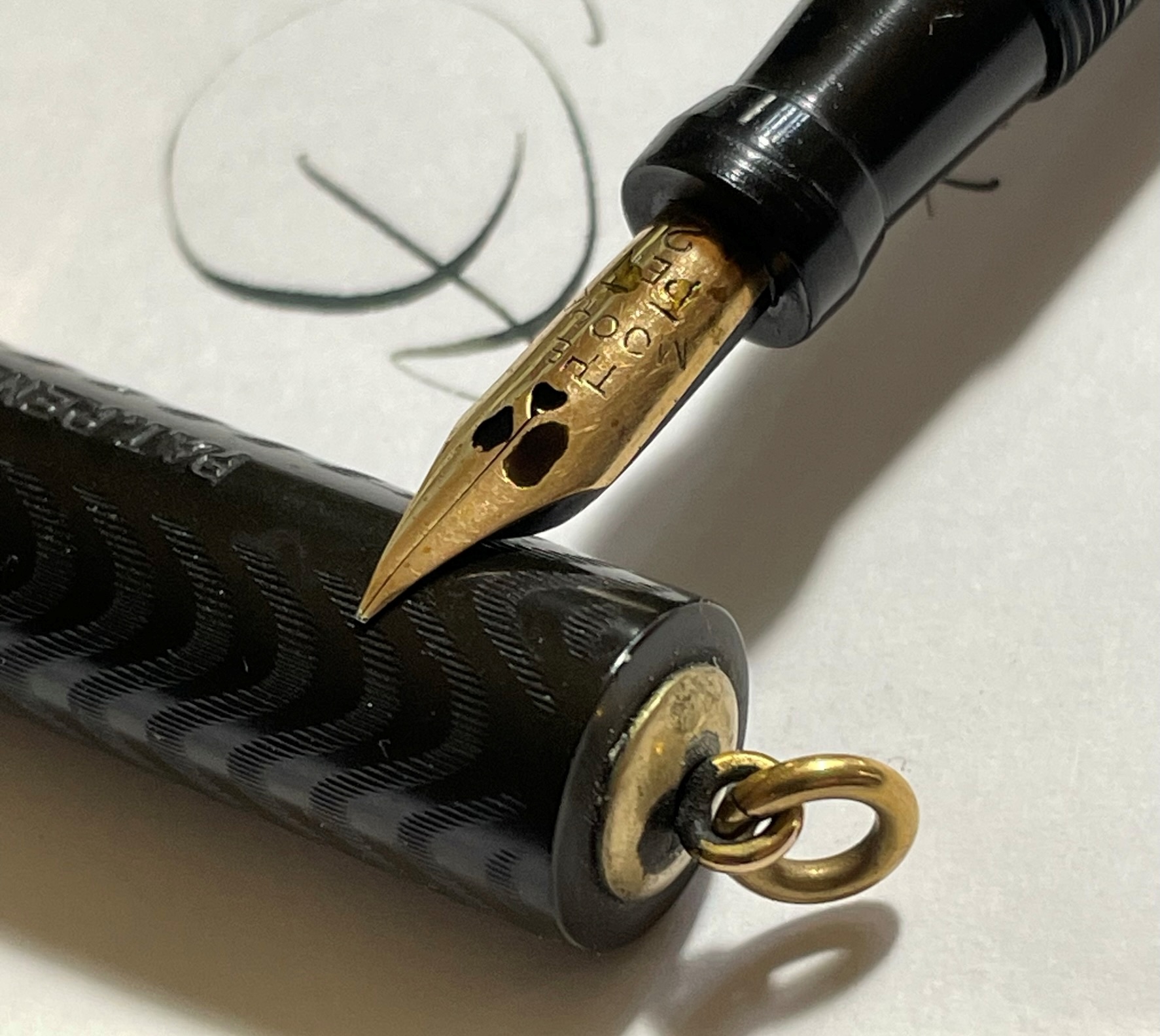 Foto di una penna Moore. Modello: Moore L-72. Caricamento a levetta. Realizzazione in ebanite nera cesellata a onde. Dettaglio della testa del cappuccio. Dettaglio del pennino. Versione da signora con anellino, e banda cesellata sul cappuccio (denominata "Grotesque Band" nel catalogo del 1925). Contributo di Serena, (utente forum serena900).