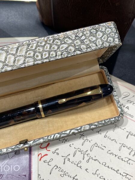 Foto di una penna Nettuno. Modello: Nettuno Docet. Caricamento a stantuffo. Realizzazione in celluloide marmorizzata marrone. Modello ogivale. Contributo di Giuliano, (utente forum Giu1963).