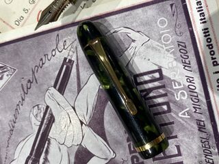 Foto di una penna Nettuno. Modello: Nettuno Docet. Caricamento a stantuffo. Realizzazione in celluloide marmorizzata verde. Dettaglio del cappuccio. Modello ogivale. Contributo di Giuliano, (utente forum Giu1963).