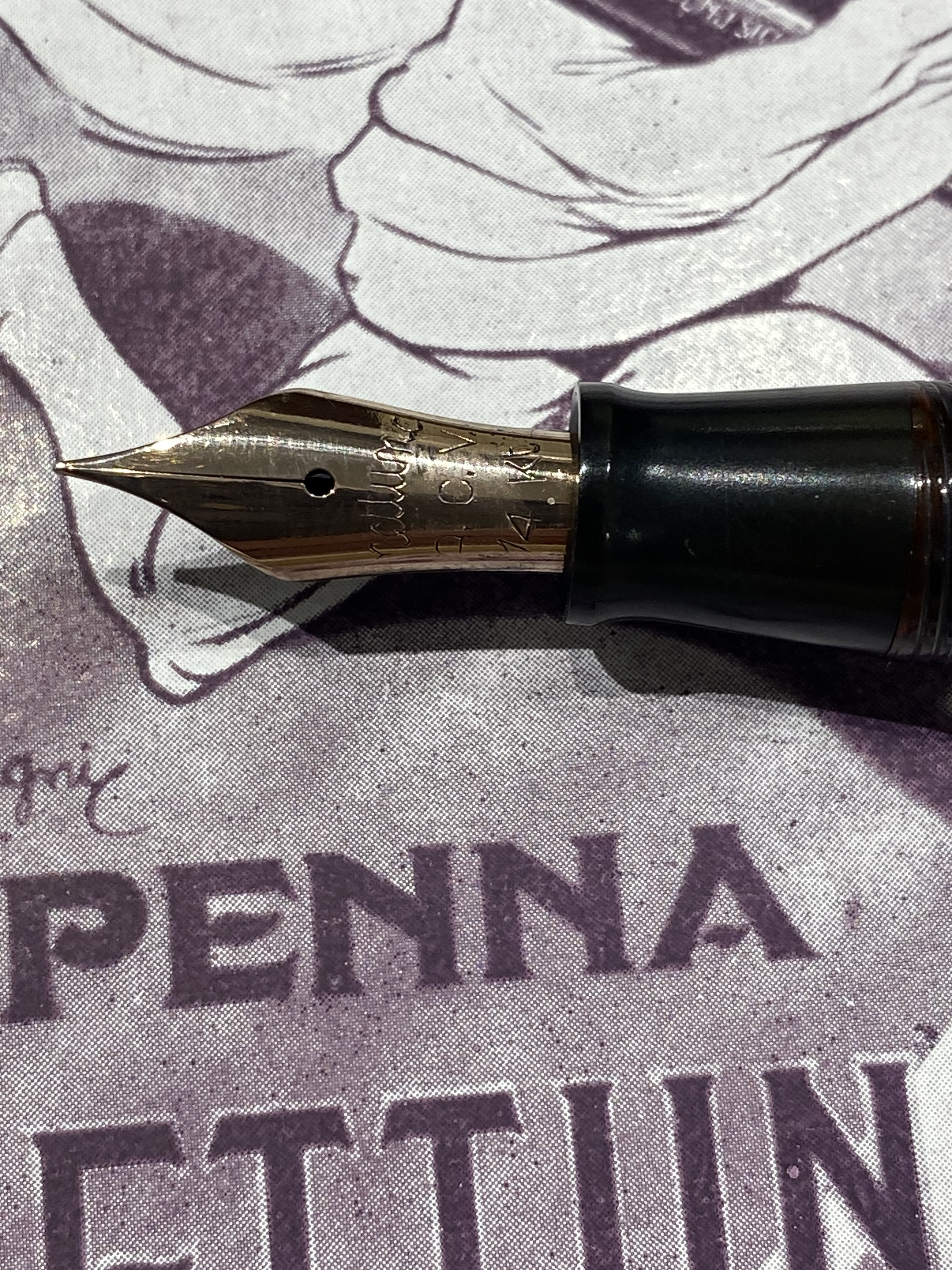 Foto di una penna Nettuno. Modello: Nettuno Export. Caricamento a stantuffo. Realizzazione in celluloide striata verde. Dettaglio del pennino. Modello ogivale con veretta sottile e clip incassata nella testina, prima versione, periodo incerto fra gli anni '40 ed i '50. Contributo di Giuliano, (utente forum Giu1963).