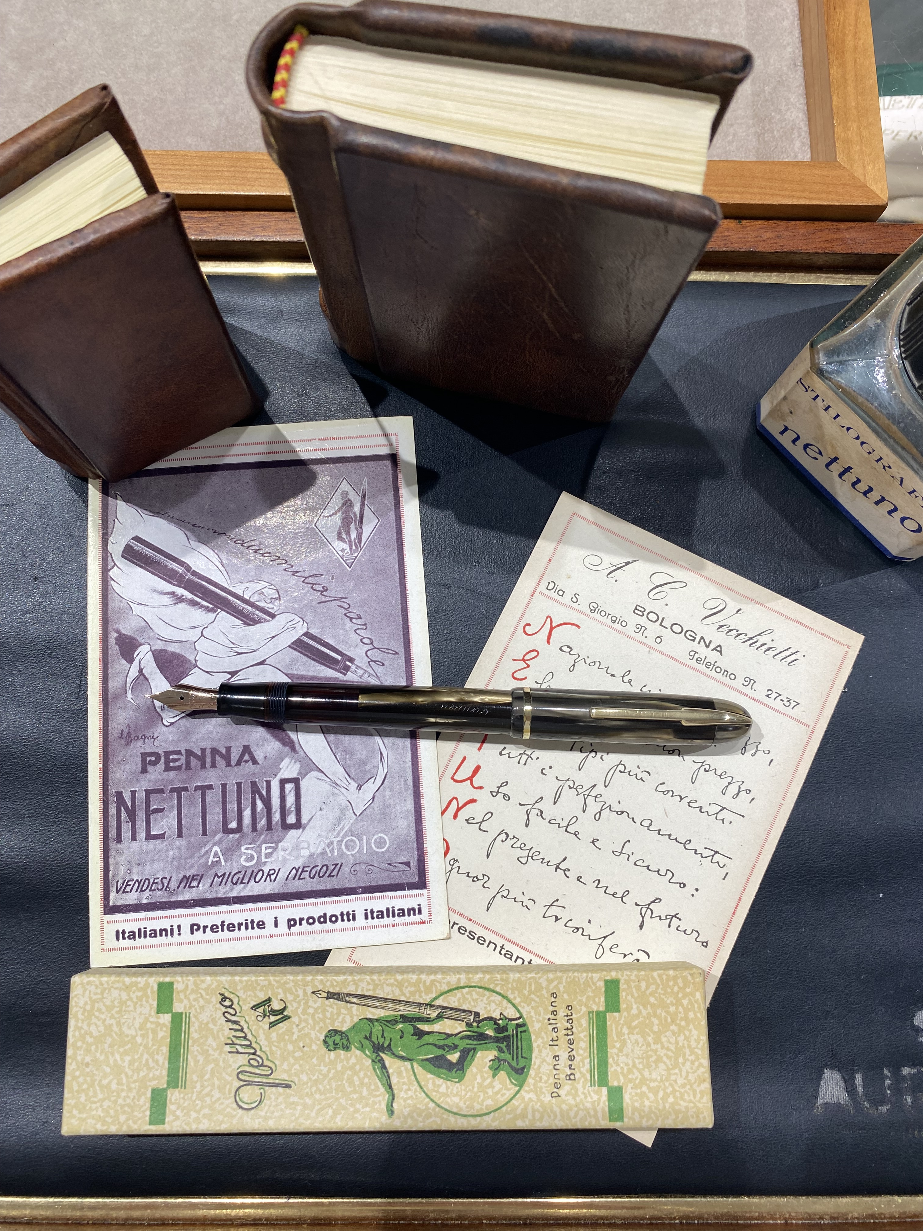 Foto di una penna Nettuno. Modello: Nettuno Export. Caricamento a stantuffo. Realizzazione in celluloide striata verde. Modello ogivale con veretta sottile e clip incassata nella testina, prima versione, periodo incerto fra gli anni '40 ed i '50. Contributo di Giuliano, (utente forum Giu1963).