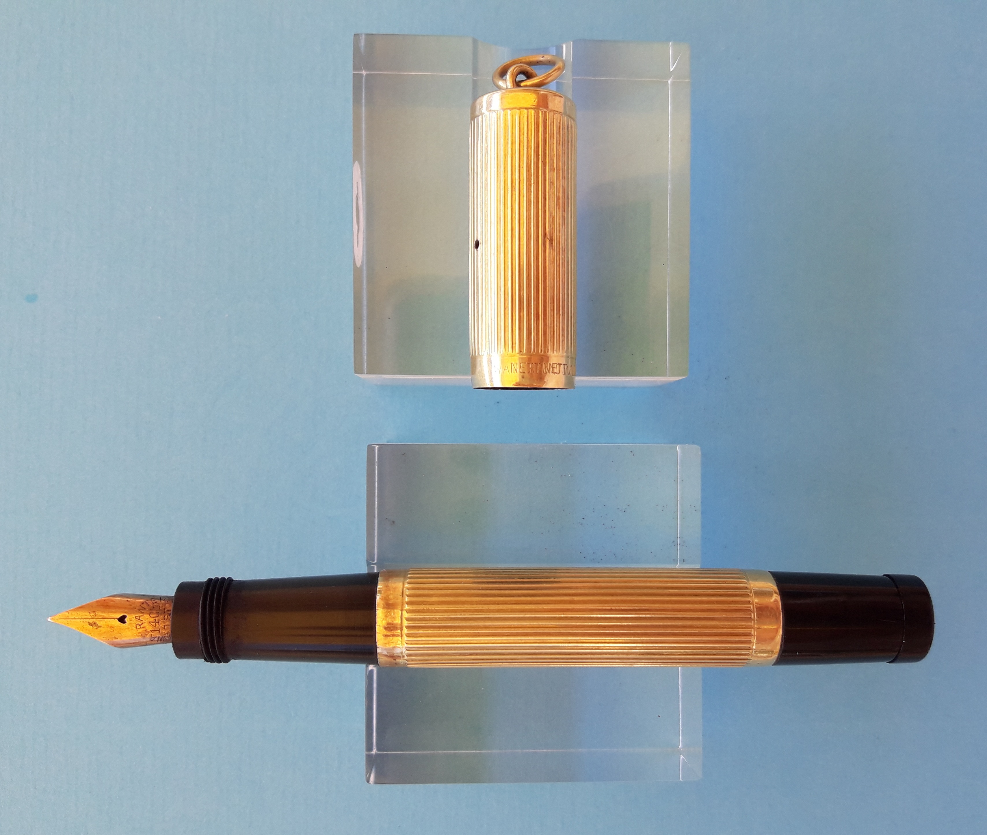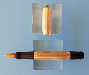 Photo of a pen produced by Nettuno. Model: Nettuno 500. Filling system: safety. With orizontal lined gold rolled overlay. One of the oldest production models, lady version.