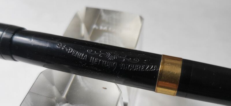 Photo of a pen produced by Nettuno. Model: Nettuno 504. Filling system: safety. In smooth black hard rubber. Detail of inscription. Rolled gold bands and ring cap model.