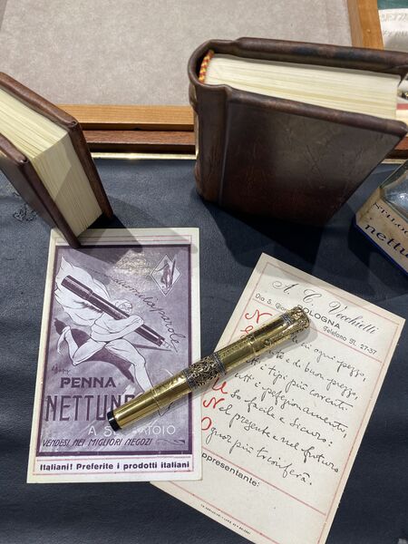 Photo of a pen produced by Nettuno. Model: Nettuno 50x. Filling system: safety. With geometric pattern and band gold rolled overlay. Size not specified, very elaborate decoration with gallery bands.
