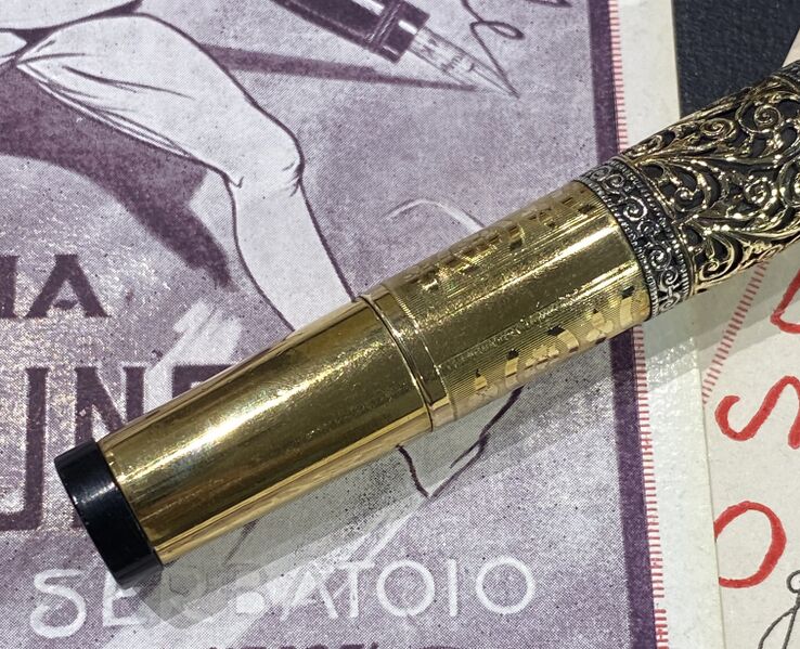 Photo of a pen produced by Nettuno. Model: Nettuno 50x. Filling system: safety. With geometric pattern and band gold rolled overlay. Detail of knob. Size not specified, very elaborate decoration with gallery bands.