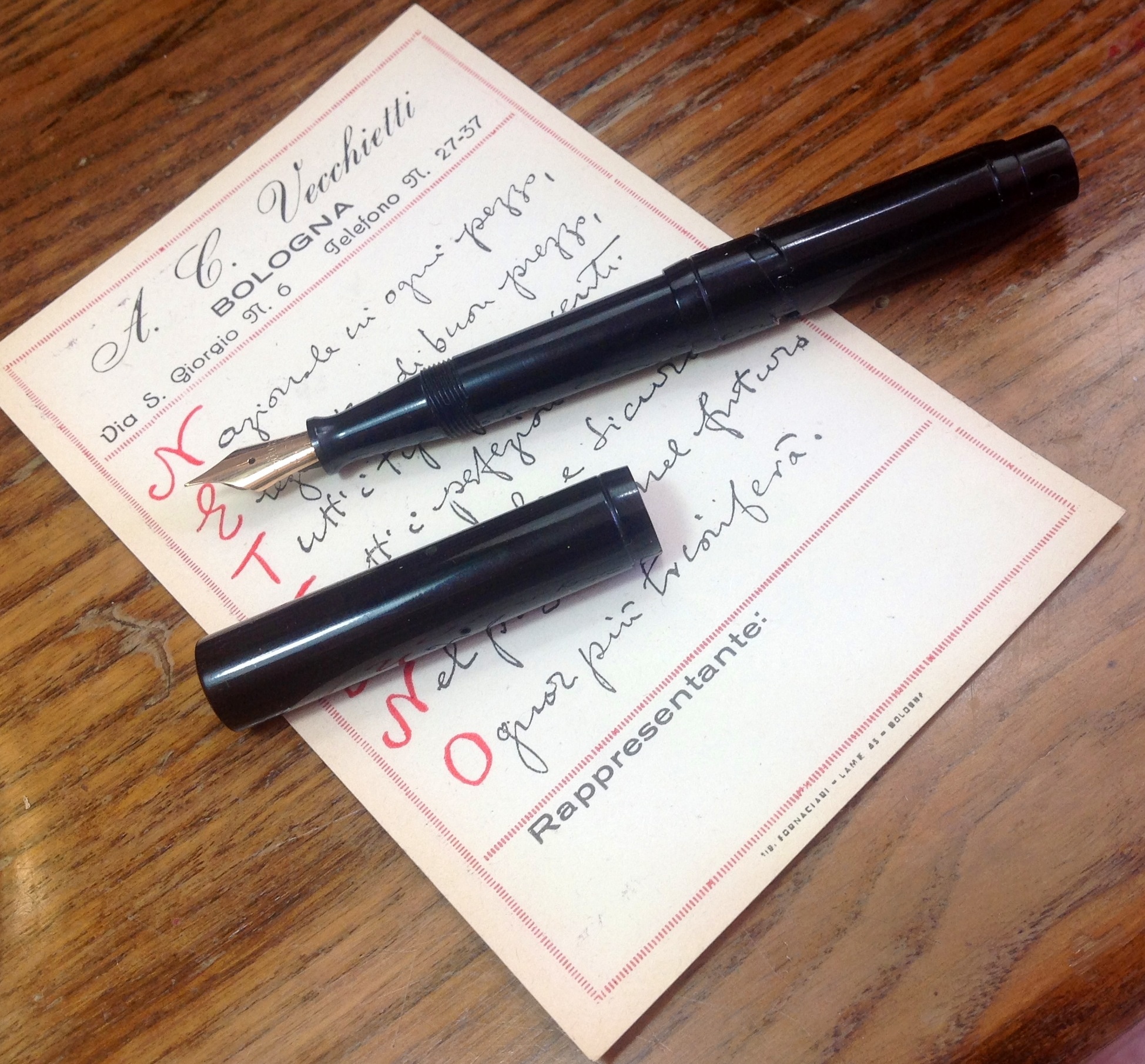 Photo of a pen produced by Nettuno. Model: Penna Nettuno Sicurezza. Filling system: twist filler. In black hard rubber. A peculiar twist filler variant.