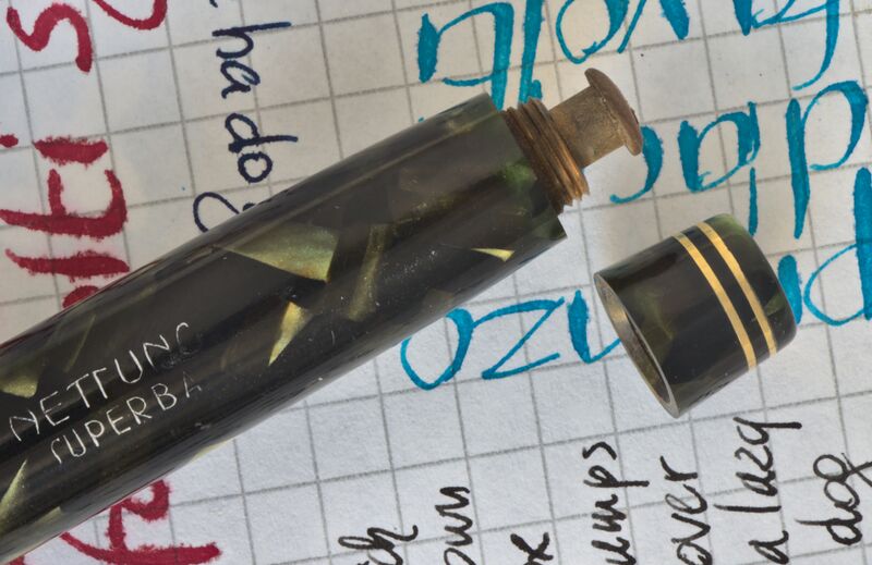 Foto di una penna Nettuno. Modello: Nettuno Superba. Caricamento a pulsante di fondo. Realizzazione in celluloide marmorizzata verde. Dettaglio del tappo posteriore. Dettaglio del caricamento. Versione grande.