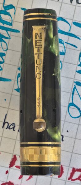 Photo of a pen produced by Nettuno. Model: Nettuno Superba. Filling system: button filler. In green marbled celluloid. Detail of cap. Big size version.