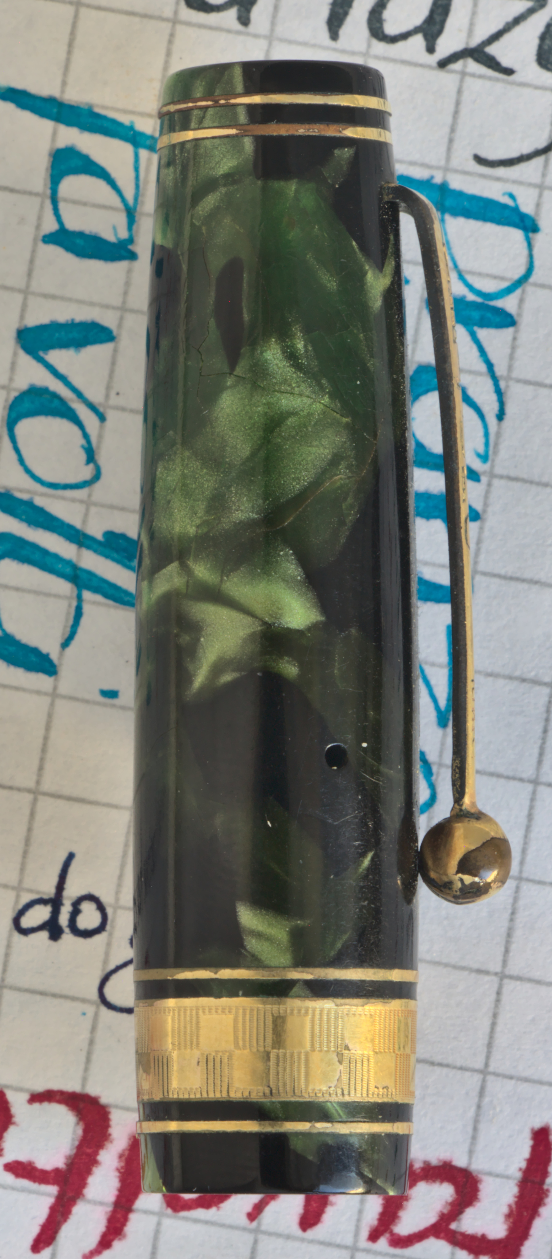 Foto di una penna Nettuno. Modello: Nettuno Superba. Caricamento a pulsante di fondo. Realizzazione in celluloide marmorizzata verde. Dettaglio del cappuccio. Versione grande.