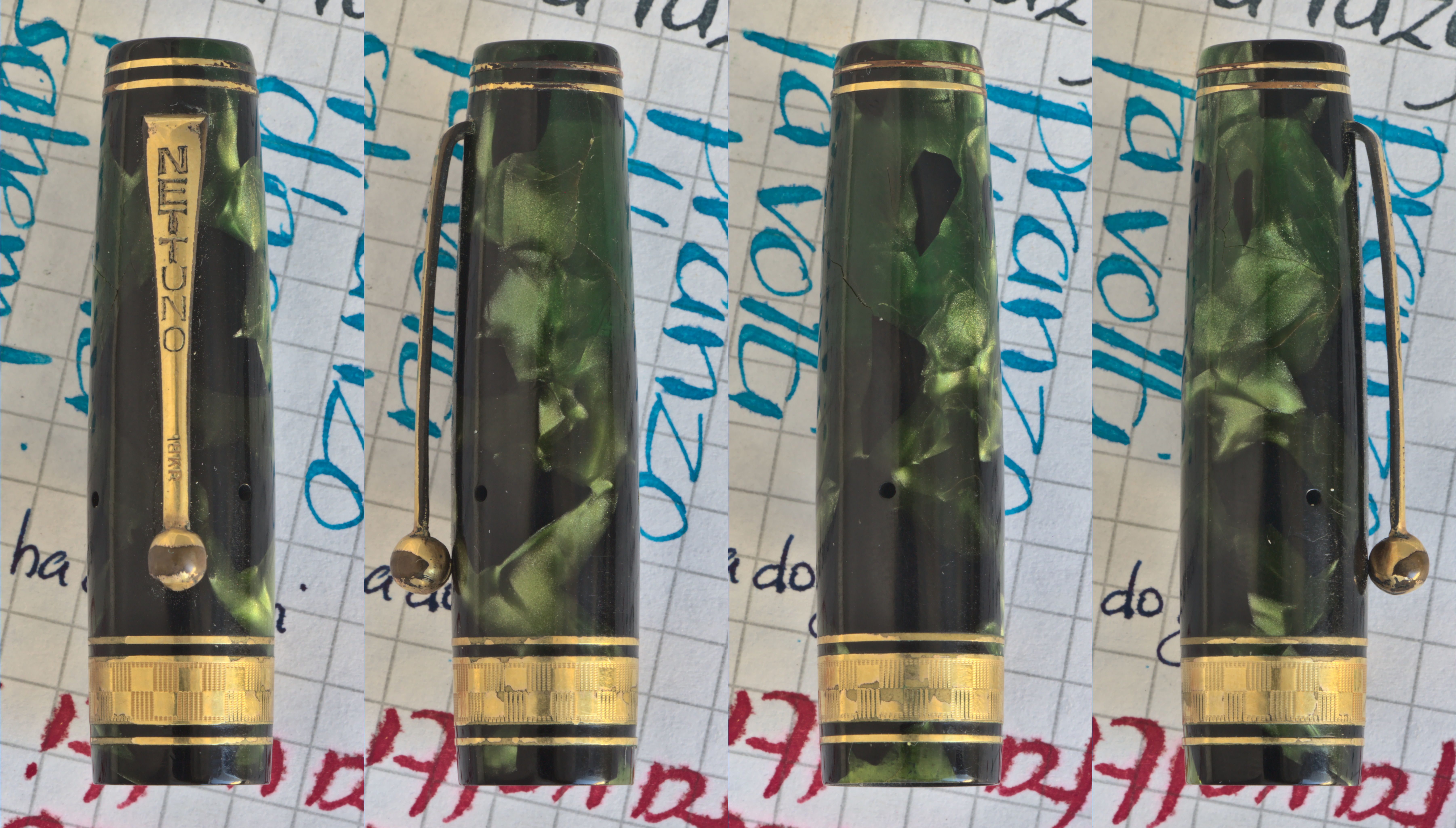 Foto di una penna Nettuno. Modello: Nettuno Superba. Caricamento a pulsante di fondo. Realizzazione in celluloide marmorizzata verde. Dettaglio del cappuccio. Versione grande.