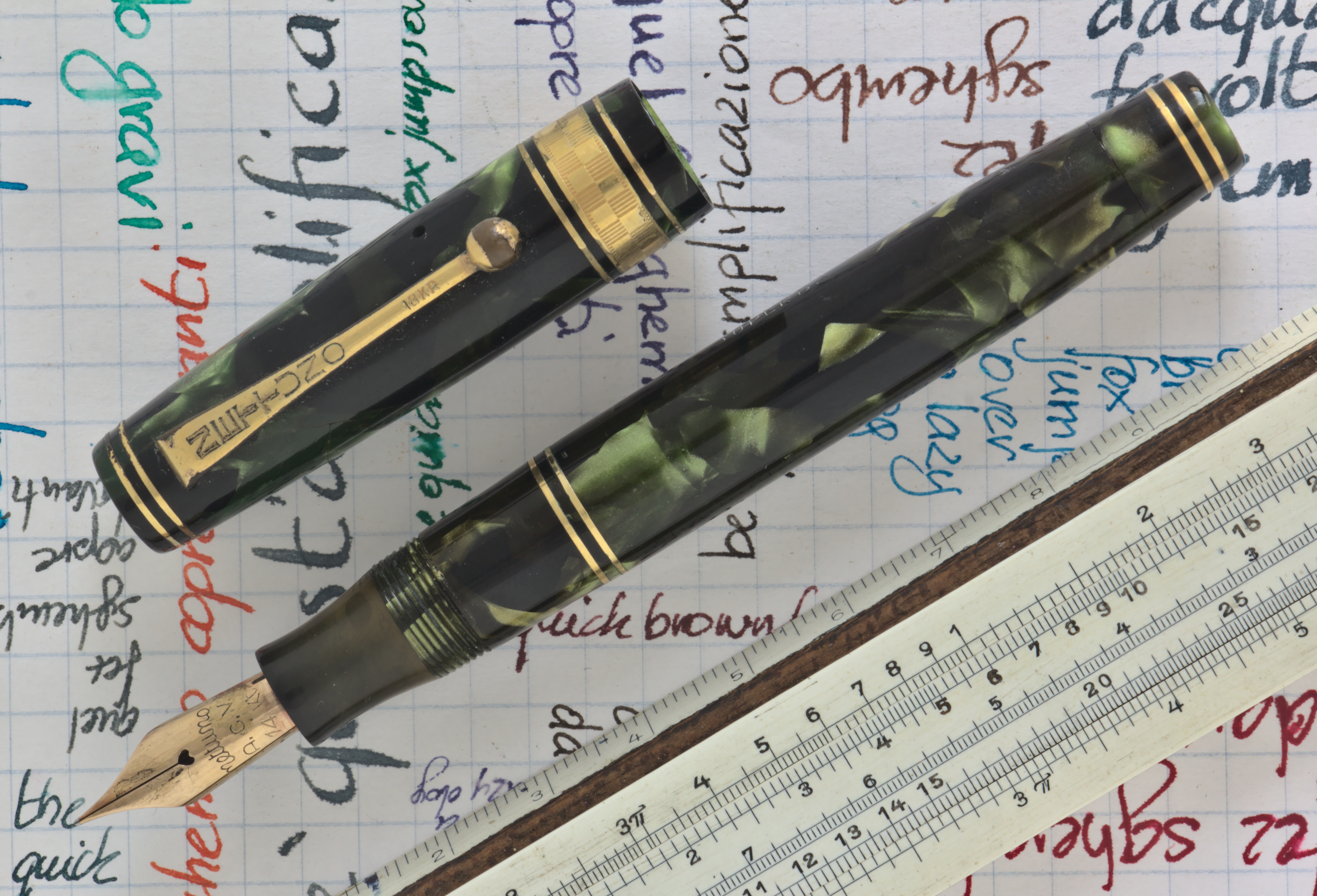 Foto di una penna Nettuno. Modello: Nettuno Superba. Caricamento a pulsante di fondo. Realizzazione in celluloide marmorizzata verde. Versione grande.